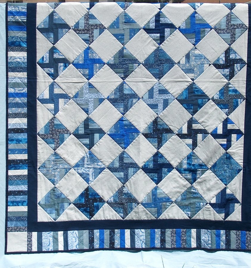 mevans7945 Phillip's Quilt - I made this quilt for my grandson's 18th birthday. It consists of shades of blue and gray, and is 100% cotton (top, batting and backing). The backing is solid navy. Stitch-in-the-ditch machine quilted on my Janome sewing machine.