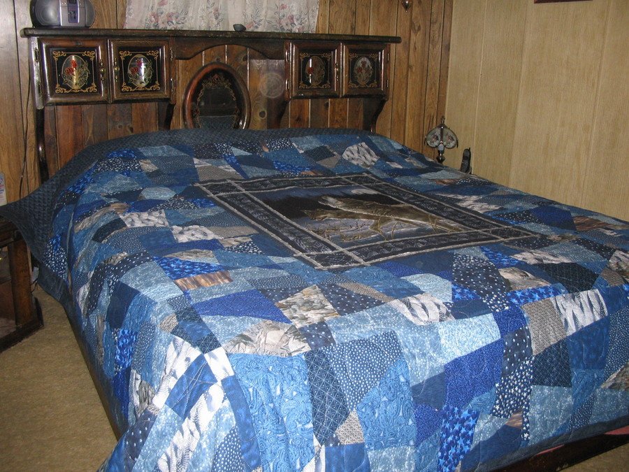 Sasha Wolves Dance in Winter Moonlight - A request from my sister for a quilt for her mother in-law prompted me to create Wolves. A pre-printed centre panel surrounded by free form blocks and boarders. This became the first in a series of quilts using pre-printed panels and the basis for my class - fun with panels.