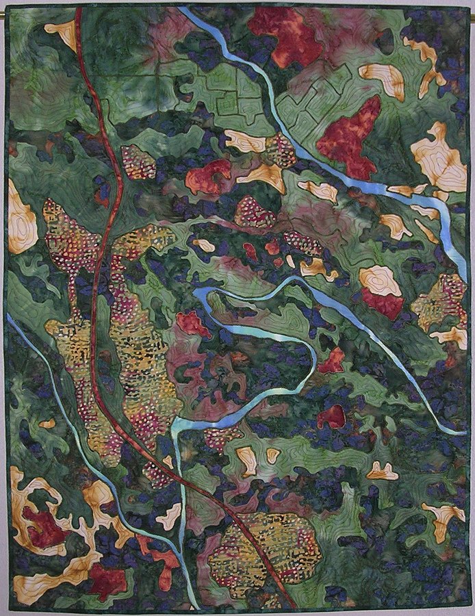 dphock Above Healdsburg - I used an aerial photo of my town as the inspiration for this quilt. I experimented with reverse applique to add different layers of fabric. The river fabric was fabric I'd dyed by pouring dye as the fabric hung draped over a rod, which made for a streaky result. I love how it looks like light reflecting off of water.
