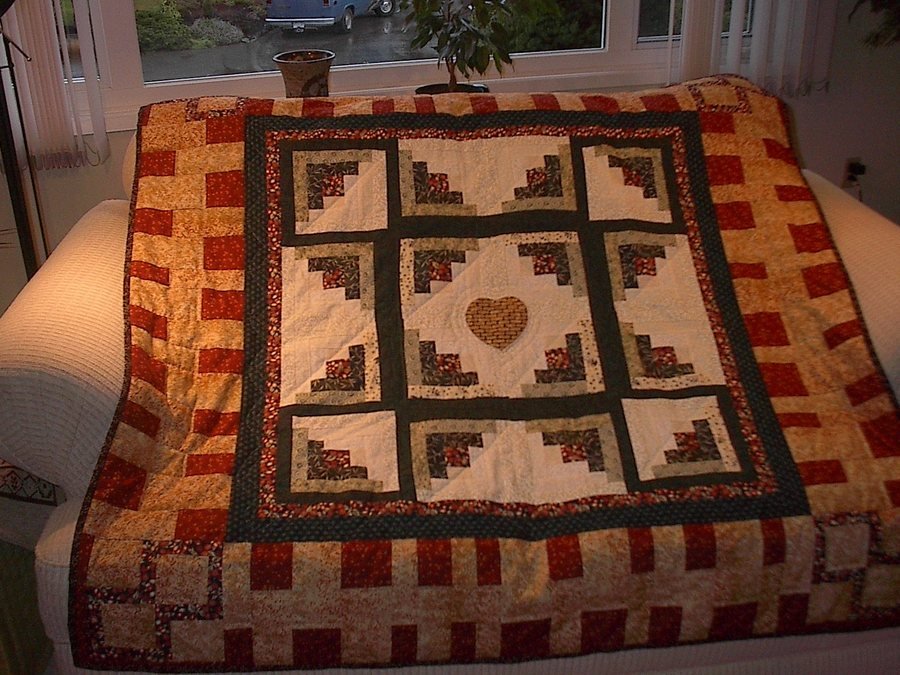 WestCoaster Dori's Quilt - I made this quilt for Dori, a friend who lives in the town where my husband and I met. I don't know why, but I thought she needed it, and sure enough, she was in some marital problems, which she confessed in her thank you note. The four corners--the Patience blocks--represent her four children. Love is central to her life. She does everything with passion: schoolteaching, raising kids, keeping up with friends. There's a star in the design to represent Dori. She told me she picked up the parcel at the Post Office, and was so delighted that she stopped several neighbours on the way home to show them the gift.