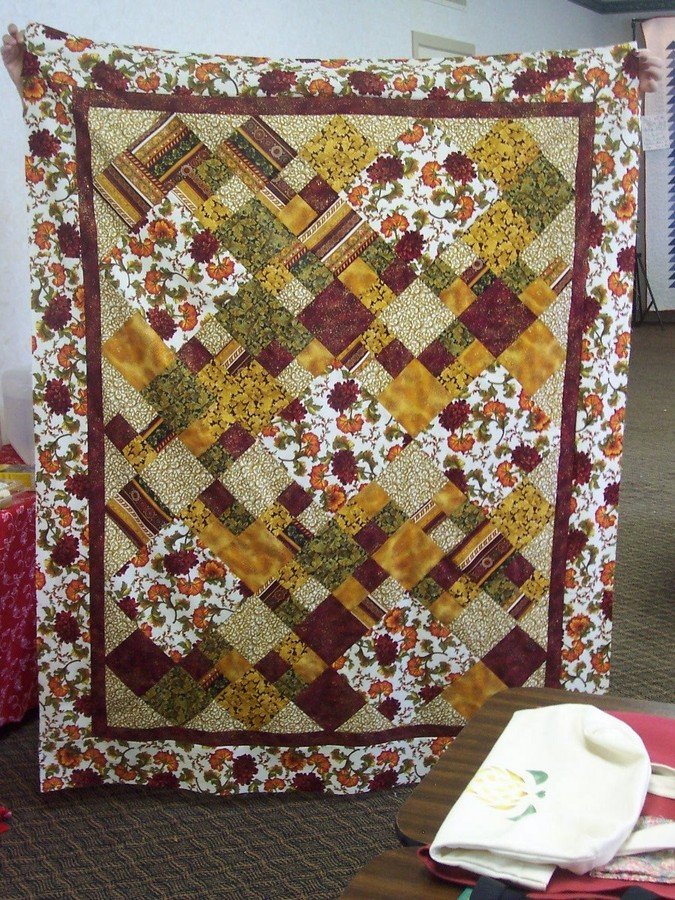 Cathysmom Fall Contra Dance - My friend and I went on a Quilting Retreat and one of the projects was the Contra Dance. Now I had originally purchased the pattern and had my own kit but when I saw the colors in this kit for sale I just had to get it! The picture doesnt do the fabrics justice. It's a really lush, regal looking top. As soon as the backing arrives it will be quilted and entered in my very first guild show in the spring!!