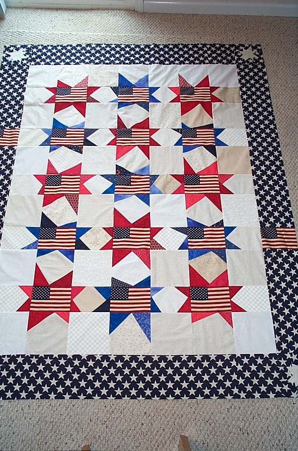 Bluesbroad For a Veteran - The quilt was started in Texas at a retreat. When it was finished, I knew it had to go to a vet at the Murfreesboro (TN) Veterans Administration rest home. Luana quilted it when I decided to donate it. I don't know who received it; I just hope the vet is warm and knows the love that went into its making.