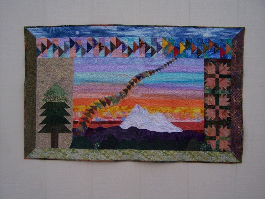 DarFar Grassland Sunset - Applique of Mt. Shasta, foothills and tree line from my living room window. It is appliqued over hand dyes colored like the many sunsets here. It has appliqued stylized flying geese across it and is bordered by a pieced tree (to represent the forest), flying geese,(to represent the name of the Ranger district and we are located on the Pacific flyway) Bear paw (to represent Smokey the Bear). The final frame is done with fabrics to represent the sky forest and grasslands.