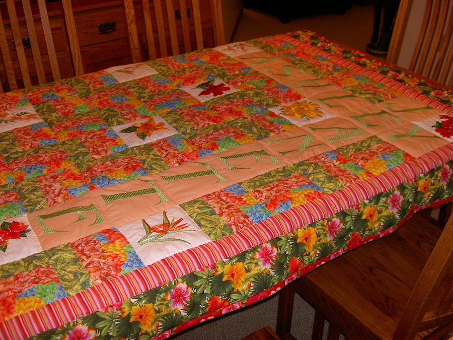 Melynda Tropical for Ashley - Stitched in the Ditch. Has matching pillow. The tropical flowers and the letters in the name are machine embroidery. It is stitched in the ditch.