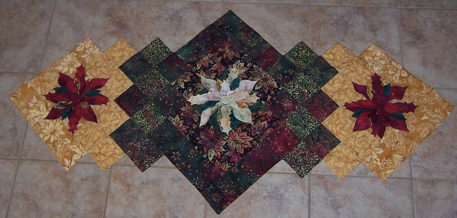| Design Source - Description | Dimensional Poinsettia designs in the center of 3 on-point Log Cabin Blocks. |