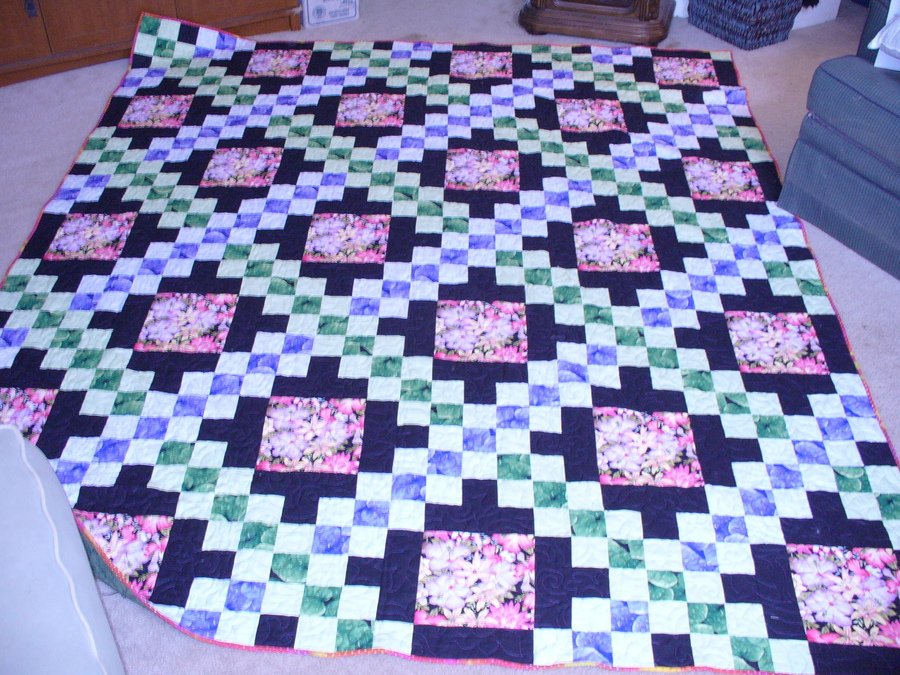 jbrown1265 Momma's Dowry - My mother ran away and got married at the naive young age of 72... yup, she eloped and called us on Friday night and said ' We're gettin' married in the morning' just like in the song... We were not able to drop everything and make the trip, so I set out to make a quilt for them as her dowry in her favorite colors. When she saw it in work, she was not thrilled with the black...she would have prefered white...but I asked her to trust me on this. She did and when she opened the finished quilt she was stunned. I warmed my heart that she likes it. She often teases me about my quilting, saying I 'take perfectly good fabric, cut it up into little tiny pieces and spend hours sewing it back together again'.