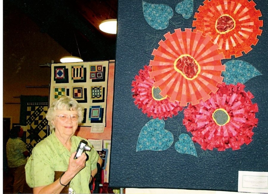 MilliinMA Zinnias - Zinnias are bold and bright. It was in the Chelmsford Quilters Guild show last year. I am next to it!