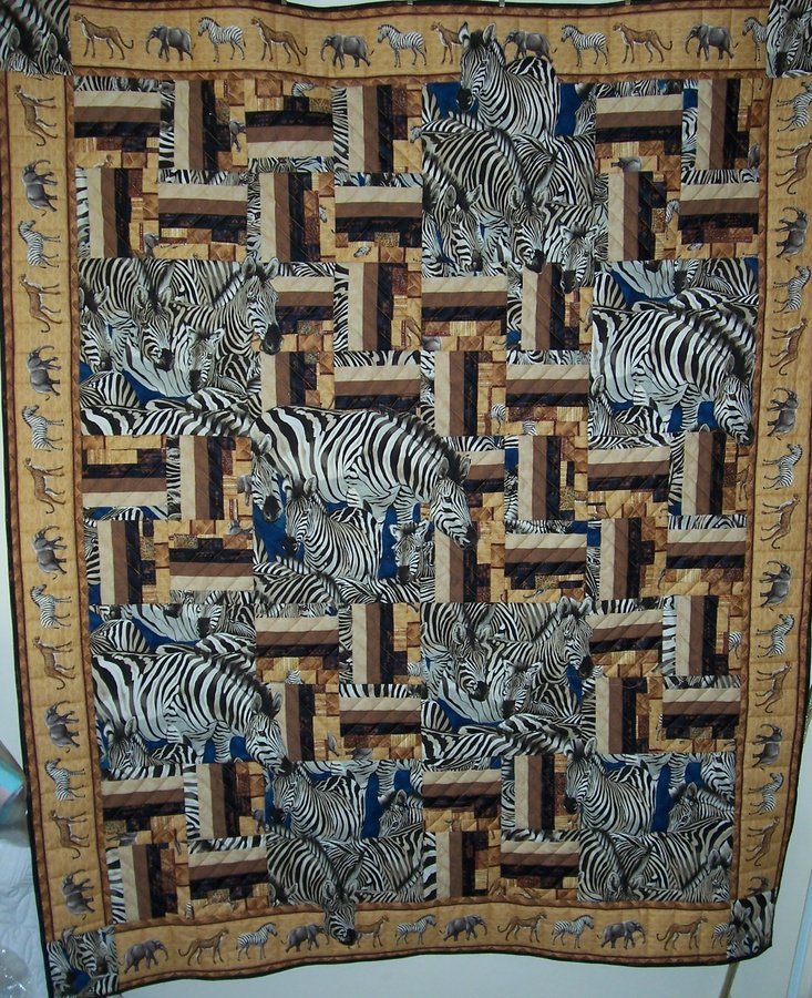 jhwolf Zebra Quilt - I saw a quilt done by Angie of the yahoo group Home Quilting Systems and adapted the rail fence pattern to include the large squares of the Michael Miller Zebra fabric. I raw edge appliqued the Zebras to come out of the squares to give a 3 dimensional effect.