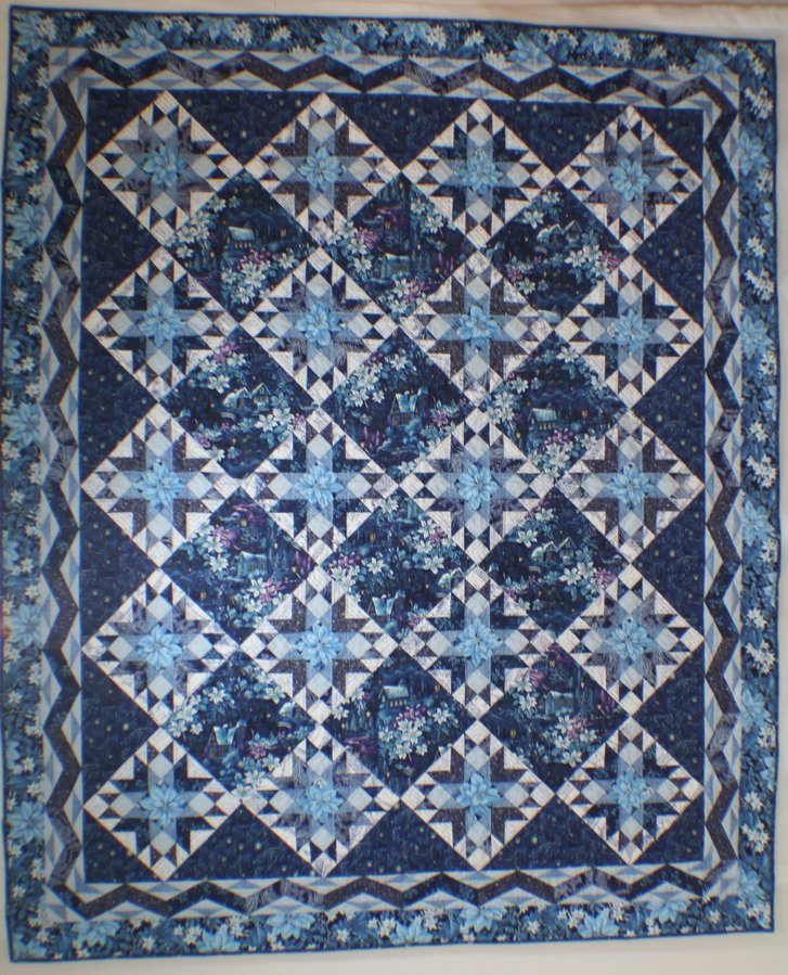 | Design Source - Description | I love blue Christmas decorations, so a blue quilt for Christmas seemed obvious. It took me several years to gather the fabrics, but making it was a lot of fun. |