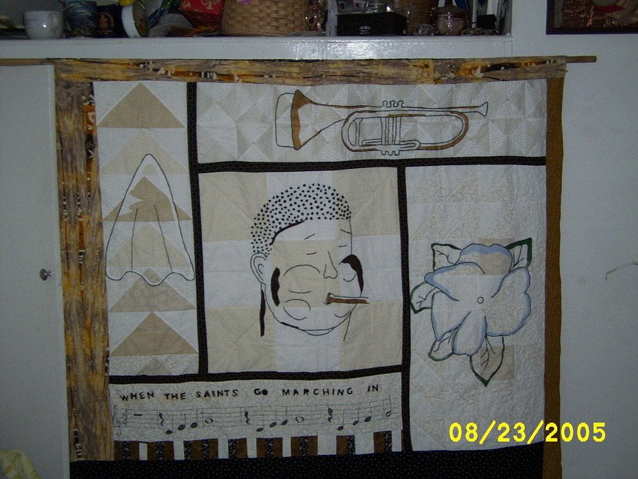 carolynburgess WHEN THE SAINTS GO MARCHING IN - The Quilt is a Jazz quilt. It depicts Miles Davis, Louis Armstrong, Billie Holiday and Dizzy Gillespie.