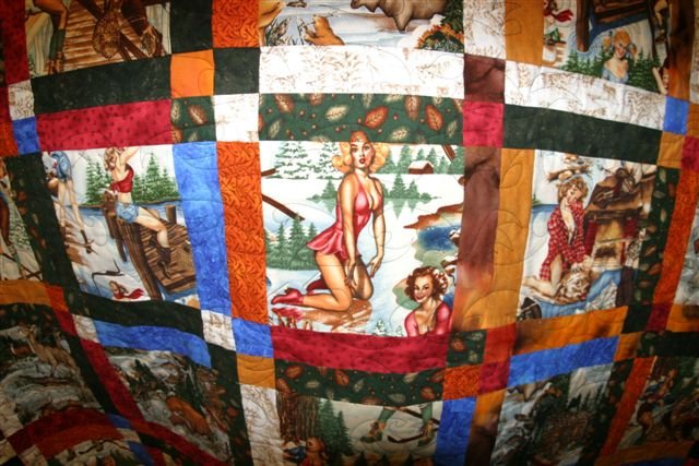 quiltmonkey Dreamgirls for Hubby - The main fabrics come from a Alexander Henry line. I fussy cut the gorgeous pin-up girls doing outdoor sports and then added colorful sashing around each block. I also fussy cut some moose, bear, cabins, canoes, and fish to give the overall quilt some "balance" (cuz it can't just have only gorgeous women in there!!). Sweet dreams, hubby...