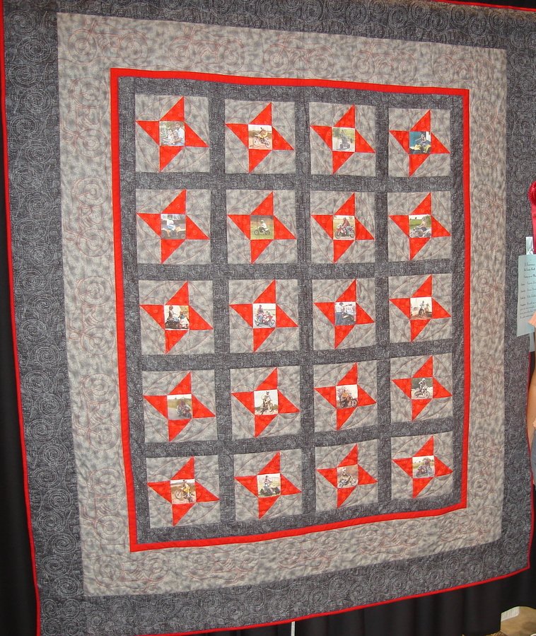drostep Growing up on Motorcycles - I made this for my nephew using the friendship block as the block design. I used pictures that I transferred to printed treasures and used them as the center of the star block. The quilter put motorcycles on the border which really adds to this quilt.