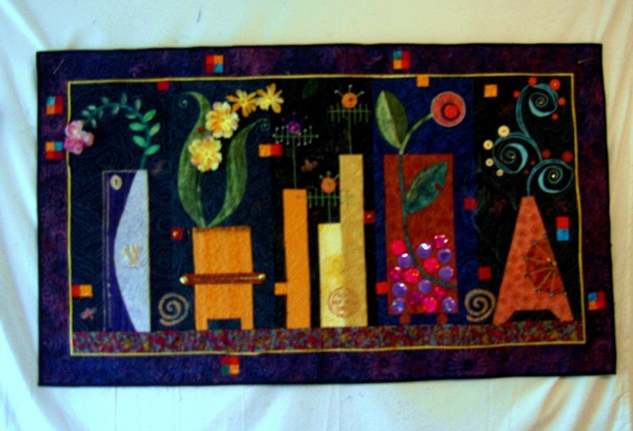 Karinlisaquilts Fantasy Table - I followed the pattern using my own fabrics. I varied some of the design and used many embellishments , such as, silk flowers, buttons, beads and stamping. I also altered the border by inserting patchwork. I really stretched myself with the machine quilting.