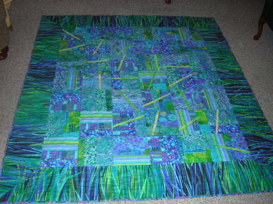 pollyporch Bluegrass - My first original art quilt. I used strip piecing with split and insert strips. Embellished with Schwarvoski crystals.