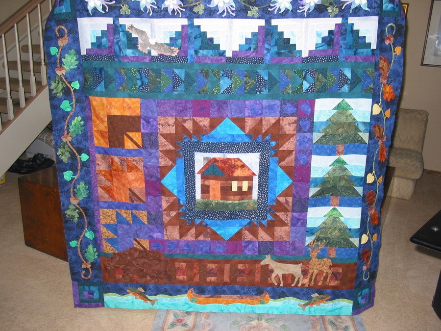 NoraWolfe Country Wedding Quilt - A cozy cabin appears in the center and there are concentric rings radiating out to the edges with appliqued animals such as a mother bear and cubs, deer, a flowing stream with a canoe and leaping trout, and naturally a bald eagle in flight. Various piecing patterns include, bears paw, logcabins and courthouse steps. Columbine vines and oak tree branches with acorns circle the outer border.