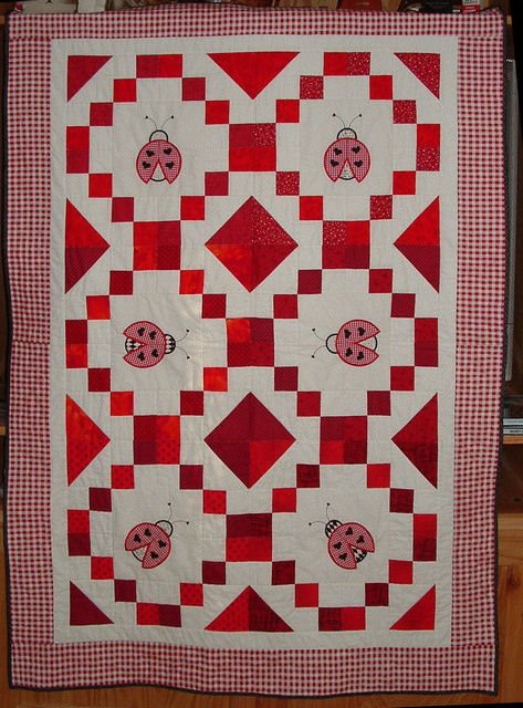 k4sew Rachel's Quilt - Various reds and blacks on white background with appliqued ladybugs