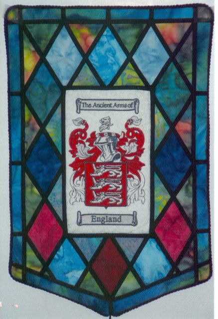 k4sew England Family Crest - Family crest machine embroidered and set in a replica of an ancient church's stained glass window