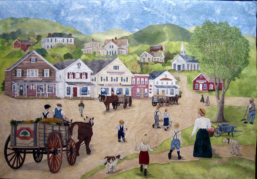 threadpainting Life in Holly Ridge - Approximately 50,000 yards of thread and 5 million stitches created the thread painted designs. No embroidery cards were used. The background fabric was hand painted and Tsukineko Inks were used to ink the doors and windows on the houses and bias sided stores. My grandchildren are the merchants in the town. It took approximately 1500 hours of frustration, a ton of trial and error and incredible fun and ultimately total joy to complete the quilt. Take a look around the town and step back in history a bit.