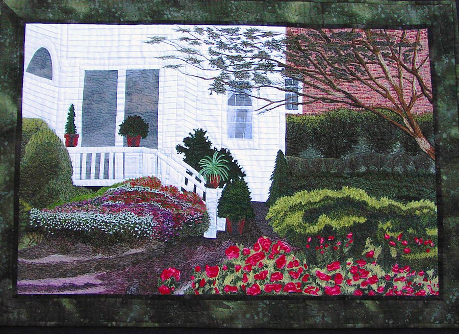 threadpainting 2 Meeting Street - While on a spring vacation in Charleston, SC, I took a photograph of a back porch of a wonderful and nostalgic bed and breakfast at 2 Meeting Street. The grounds and especially the azaleas were in magnificent bloom and I could already envision my next quilt as I snapped the picture. The quilt was hand appliquéd and except for the borders and backing, the fabric was hand-painted. The appliqué embroidery such as the flowerpots, foreground flowers and trees were achieved by free-motion machine embroidery. The quilt top was machine quilted.