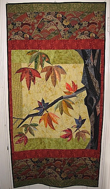 Sallyquilts Kyoto Kaede - This quilt is the product of a workshop with the wonderful Ruth McDowell. It is entirely pieced from my sketch using her freezer paper method. My original drawing was pieced in mainly Asian fabrics and mounted in the manner of a Japanese scroll painting. I was thrilled that this quilt was selected to be exhibited at the AQS Show in Nashville in 2007.