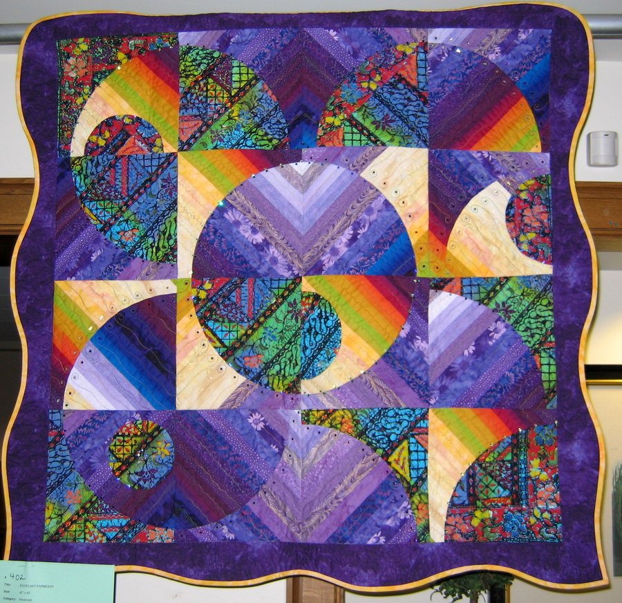 sewone Eggplant Parmesan - I used guild challenge fabric and the strips and curves technique. After machine quilting Swarovski hot fix chrystals were added in complementary colors.