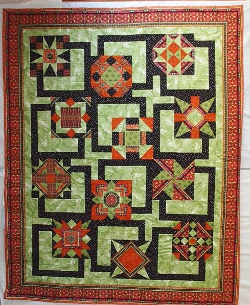 | Design Source - Description | The blocks are from Jinny Beyer's website. They all used a stripe fabric. The setting is Debbie Bowles BQ Quilt pattern. This was my niece Cassie's graduation quilt. Her favorite color is lime green. |