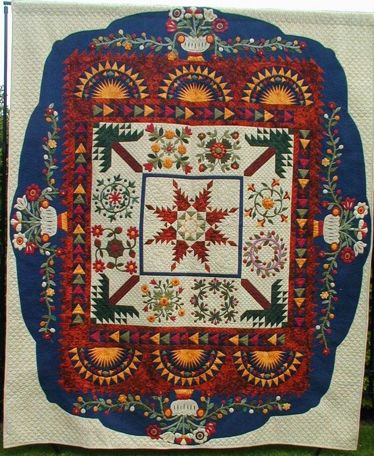 EQAddict Anniversary Dawn - I designed this quilt for the Turlock Quilt Guild's 25th anniversary show. The quilt was assembled by a committee of guild members. The pieced blocks were all done with paper piecing. The applique elements include many three dimensional techniques. The quilt was exquisitely machine quilted by Don Linn in Redding, CA.