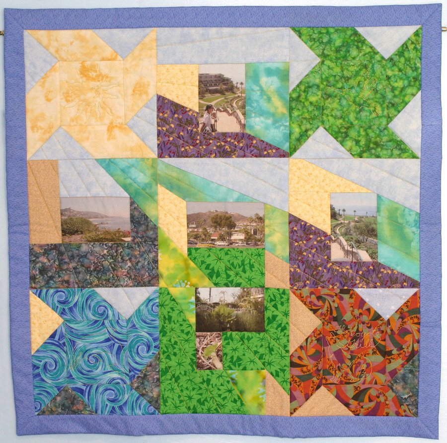 | Design Source - Description | photographs with fabrics and designs symbolic of a day in Laguna Beach CA with my sister. Includes 4 "twin sister" blocks. |