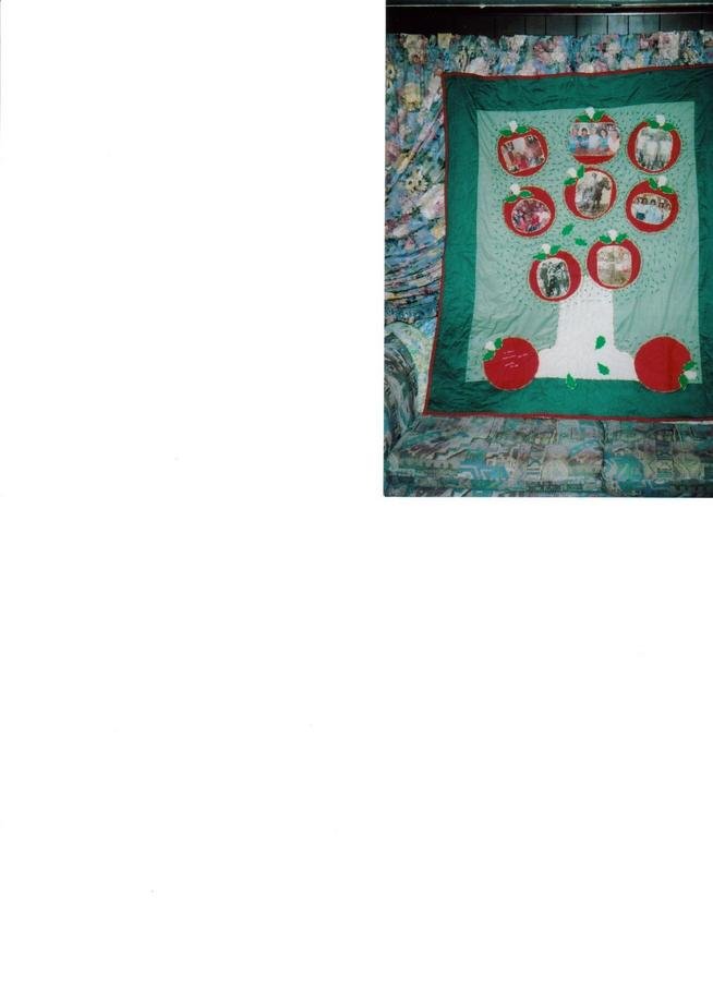 PAQUILTING Elbert's Tree of Life - Apples are appliqued, tree truck is appliqued, Leaves and stem is appliqued, quilt tied to imitate tree top, border is handquilter in and apple pattern, pictures are printed on fabric that is iron on material. Father had cancer and was under going treatment and this was his comfort quilt during his stay in the hospital.