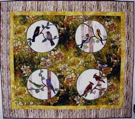 | Design Source - Description | Four sets of N. American birds. Reverse applique to set in circles. Circles constructed with strips of fabric of varying widths. Bias strip appliqued to outer edge of circles. |