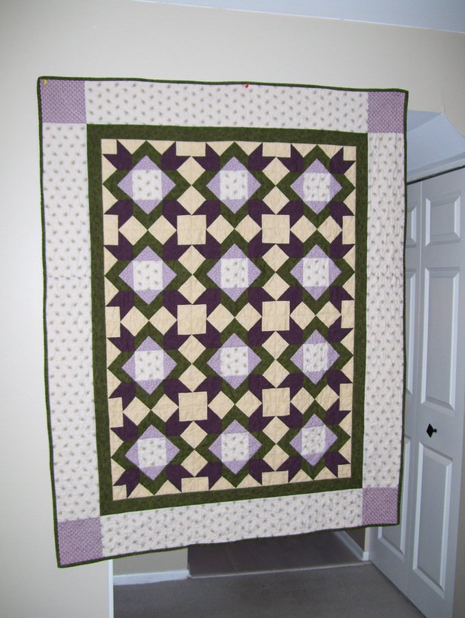 Steviesmom Lakehouse Quilt - This quilt is made for the back of the couch at my Mom and Dad's lakehouse in western Illinois. The design is inspired by a quilt I saw in a magazine, although I simplified it a bit as I'm still somewhat new to quilting. As for the quilting itself, it is not my strength and I definitely need more practice so I used invisible thread so it wouldn't stand out. I used a tulip pattern on the blocks, a circular swirl on the inside border and a rope-like stencil on the outer border. Thanks for looking, Julie
