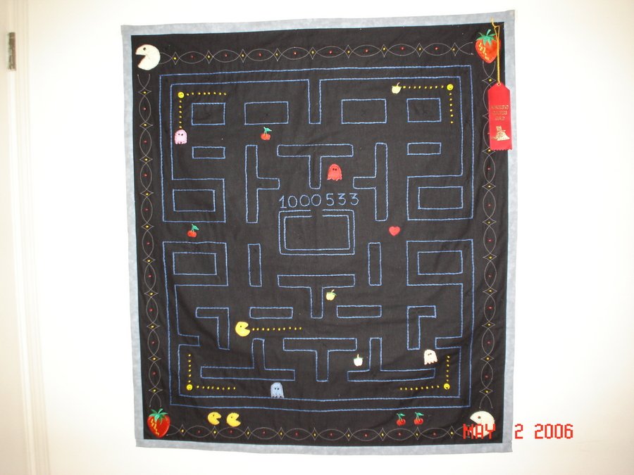 | Design Source - Description | I made this quilt from a still picture from the game pacman. And added a little extra aplicay. The yellow dots are perles and the biger one are smily buttons. |