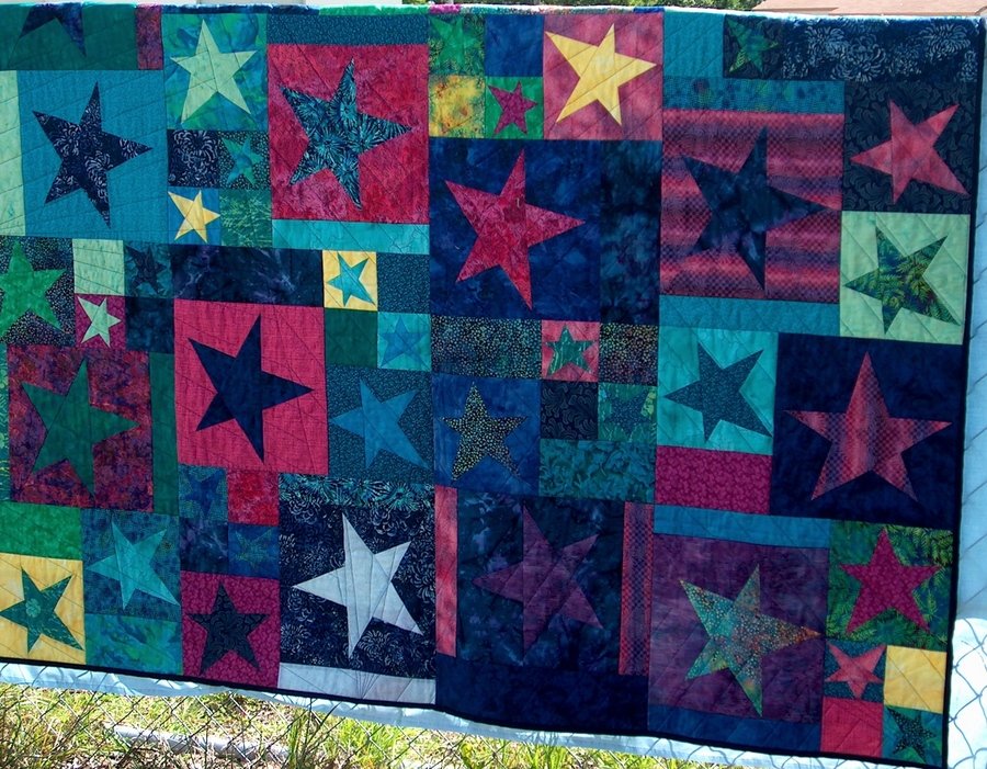mevans7945 Starry Night - I made this quilt during a class at my local quilt shop, The Good Home Quilt Company. The pattern in the book, Star Crossing by Buggy Barn, was called My Three Stars, but I changed it to Starry Night because of the colors that I chose for the quilt. The back is made up of fabrics printed with tiny white stars and leftover blocks from the front. The batting is all cotton and machine quilted on my sewing machine.