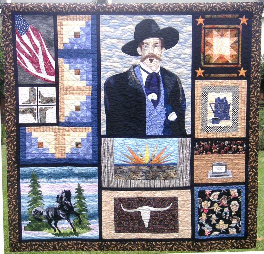 firehousequilts Remembering Doc (Holliday) - A picture of my nephew Rob, dressed in old west garb spurred the beginning of this quilted wall hanging. Rob sent me a digital photo and it was used to create the fabric portrait during an online class taken from Marilyn Belford at Quilt University. Most of the blocks are orignal design except for the star, horse & log cabin blocks. For more detailed picstures: http://home-and-garden.webshots.com/album/553925087BqtJqS