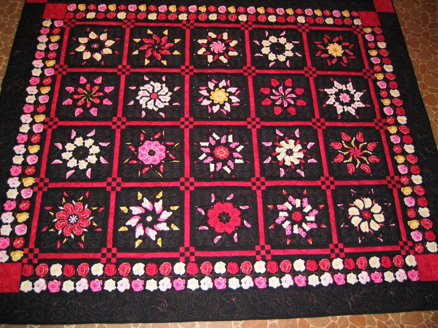 | Design Source - Description | I made the star blocks from the rose border fabric. Variegated thread & freehand quilted using the longarm. |