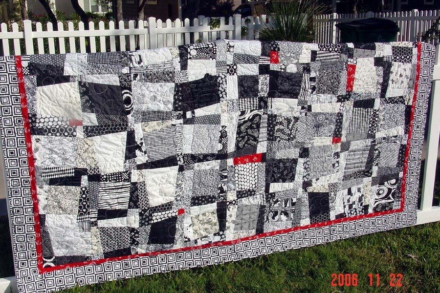 Bernell Crazy Nine Patch - This black & white with a touch of red quilt was made as a wedding gift for a relative. It was fun to make. The quilting design is circles, large & small, because most of the fabrics reminded me of water bubbles. It is engraved with the name of the birde & groom along with the wedding date.
