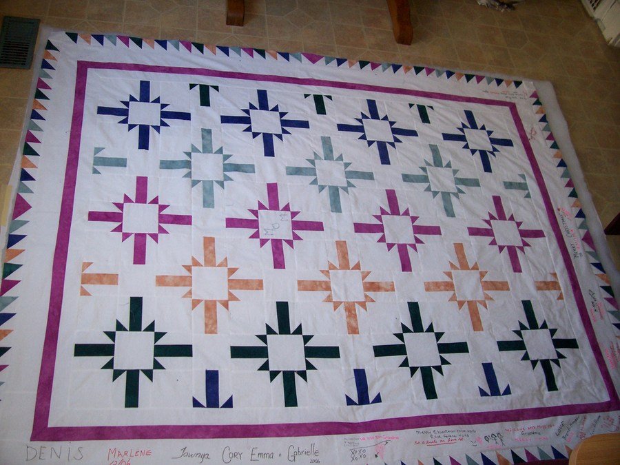 darter Old Fashioned T - I made this quilt for my mom, for Christmas 2006. I sent strips of material to all of my siblings everywhere in Canada. They all signed it, I added these strips as borders.