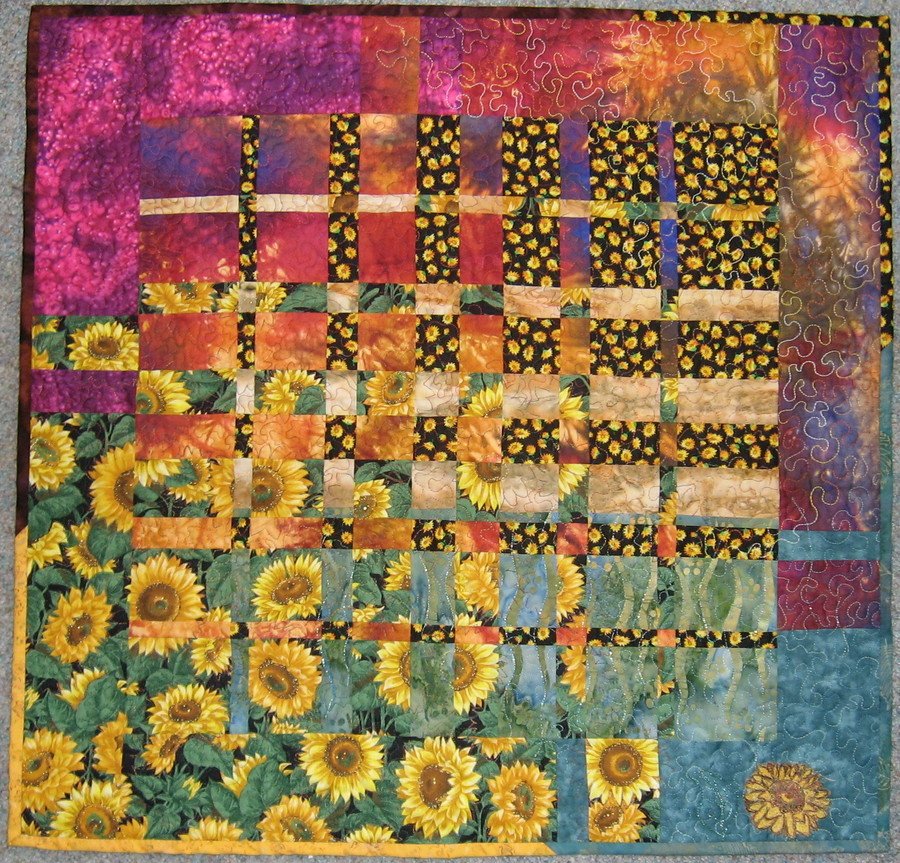 Que es KS? - This quilt is inspired by Ricky Tims visit to San Antonio; thanks to his instruction and creativity, and my stash! I've been wanting to make something for my sister, who lives in Kansas, but didn't want the same old country sunflowers. I used a large scale and a small scale print, with other batiks and dyed fabrics. I quilted it with various cotton, rayon, and metallic threads, and tacked on a thread painted sunflower done on a water soluable stabilizer. I planned the binding to accent the piece, and hand stamped and painted the solid golden color in the binding to add more interest. Thanks, Ricky!