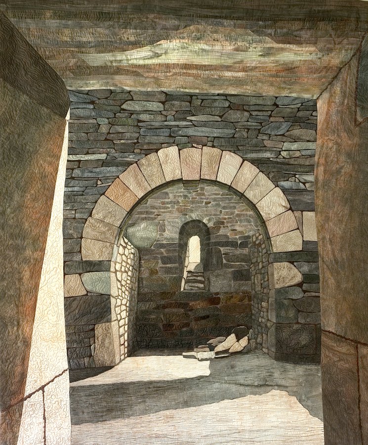 DeniseLabadie St. Kevin's Monastery ll - This art quilt is of the Trinity Church, one of 7 church ruins in St. Kevin's Monastery City, Glendalough, Co. Wicklow, Ireland. See it at the - ShawCramerGallery.com