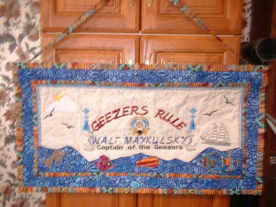 PammyMM Walt's Retirement Quilt - My husband (John) helped design this quilt for his cousin's retirement. It is now hanging in Walt's boat! I forgot to keep the final measurements, so that is a close approximation.