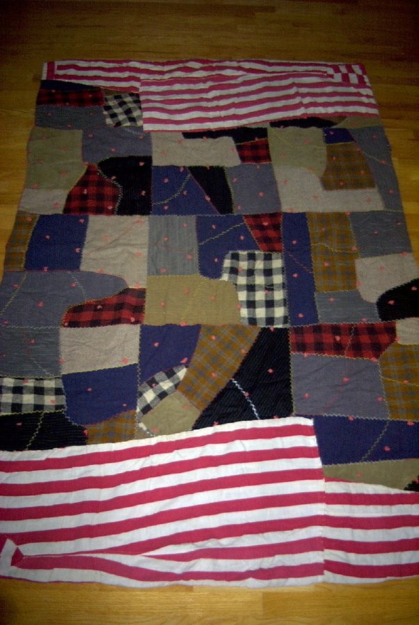 disijudy flannel pjs - I purchased this quilt at a garage sale in Munster, IN. I was drawn to it because it looked like one of those old wool crazy quilts. It looked like it might have a flag on the top & purchased it quickly because it drew a crowd when the lady said "it's old - maybe 100 years because it was our Grandma's." When I got it home to check it out, I saw that the pieces of many different types of fabric - were stitched together with feather stitches & the quilt had red & white striped fabric on both the top & bottom, the front & the back. Lo & behold, it looks like red striped pajamas folded over the top & bottom edges of the quilt. Certainly a conversation piece. Although it was/is old, there was no musty odor whatsoever. I consider it a good deal for the $5 I paid for it. When I stopped back at the same house at a sale a couple years later, the lady told me she remembered seeing that I had it displayed with the antique quilts at my guild's quilt show the year before, but she was simply not interested in giving my any information about the quilt. Too bad.