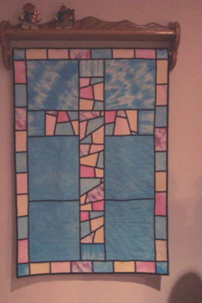 janetquilter Stained Glass Cross - Made from fabrics I hand dyed in a Hand dye workshop. I just stacked and slashed and rearranged the piles for the Cross. Used the Press on bias tape for the leading portion.