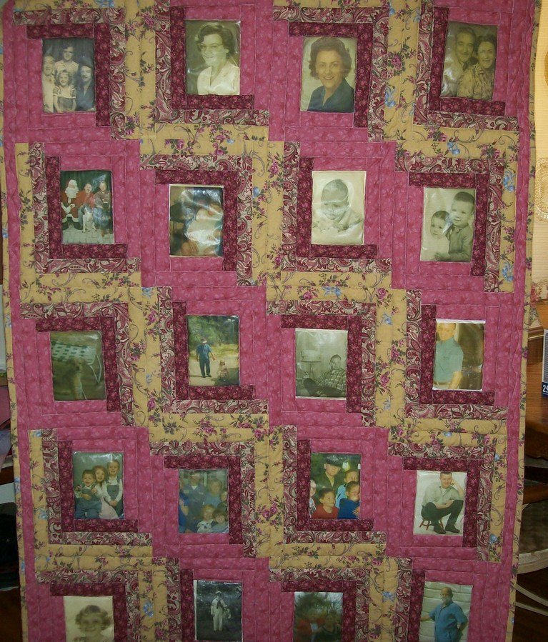 RACLDD Family - My Father die in Feb 2006 and the quilt was made for my Mother. She is a nurse and works for Hospic Of Marshall Co. They asked for a quilt for a fund raiser and needed a sample so I made her this quilt. And yes she cryed it has pictures of everyone she loves inculding her dog she had for 18 years.