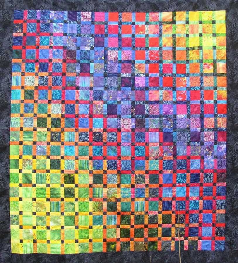 shantzsusan Bifrost - “Bifrost” comes from Norse Mythology. My daughter, Sally, laid out the center squares in a color spectrum. The sashing colors are laid out in the opposite direction.
