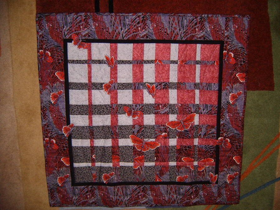 baowen Butterflies Go Free - The fabrics for this Harmonic Convergence quilt were chosen because they "sort of" went together and because I didn't think I'd use them for anything else. I wanted to test the Harmonic Convergence process before I used it with "good" fabric. As the quilt came together I liked it more and more and could envision the butterflies trying to get out from behind the "bars", and so I appliqued some butterflies on the top. Thus the title "Butterflies Go Free". Quilting was done with metallic silver thread which doesn't show up in the picture.