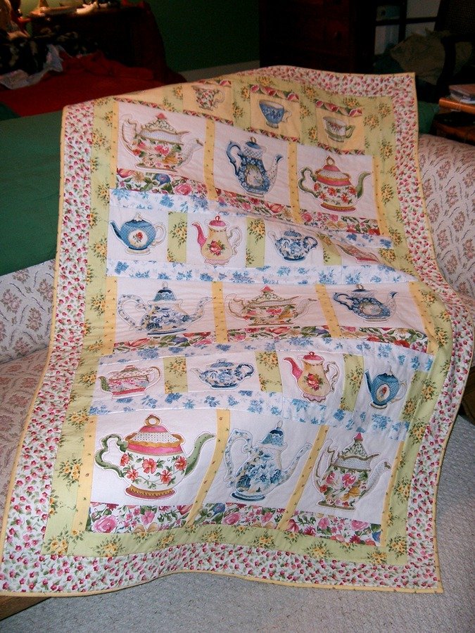 NancyO Tea Pots for Terrie - My secret pal collected tea pots, so I wanted to make her a special quilt of tea pots. Used printed tea pot fabric set in strips with sashings.