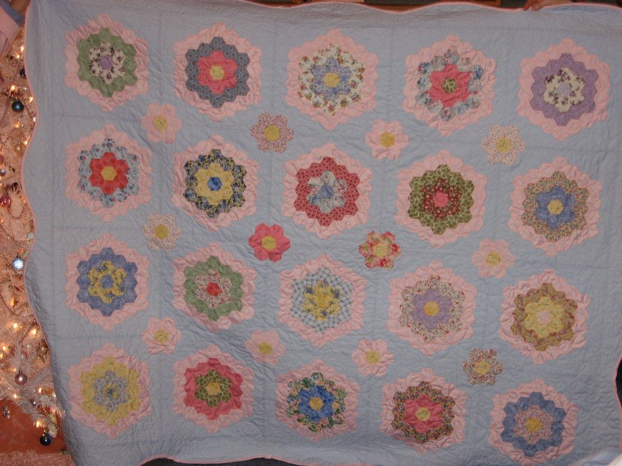 jeaken Linda's Grandmother Garden - This quilt was made for my sister's 60th birthday. The main colors are pink and blue, but I chose many small prints in a full range of pastels. I used two inch plastic templates to sew each block together. There are 20 large flowers and 12 small flowers which I appliqued to the blue dotted background. It took 3 years to complete this quilt. I presented to my sister Christmas 2006. She loves it!