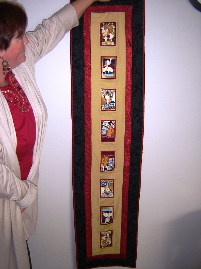 | Design Source - Description | Table runner, focus blocks cut from opera themed fabic. Inner border of same red synthetic as third border & binding. |