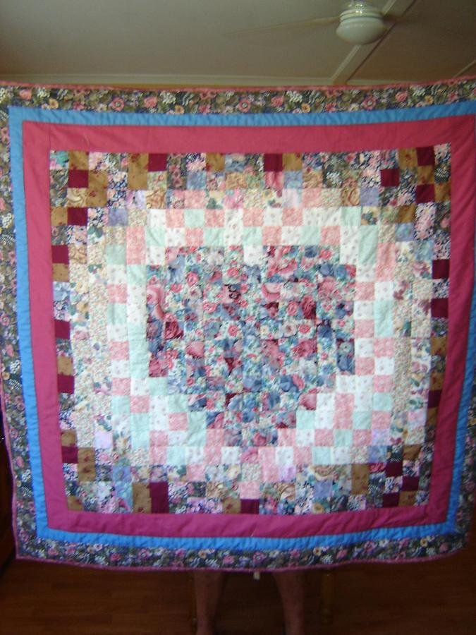 tinlizzie My Rosy Heart - 440 2 1/2 in squares in mostly rose patterned fabrics. I use it as a table cover or extra throw on my bed.
