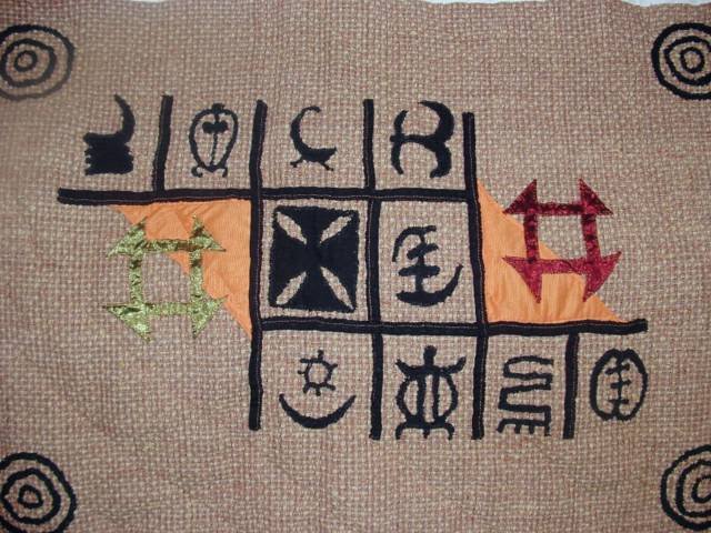 | Design Source - Description | A small wall quilt that uses Adinkra symbols from the Ghanaian Ashanti tribe. The occasion was M. Ayodele's 30th birthday. All the symbols were sketched freehand and then cut into applique templates. |